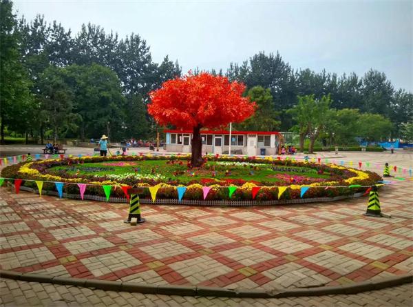 此次摆花分别在东门、西门、北门摆放以“喜迎国庆”为主题的花坛,并在中心广场摆放以“秋天童话”为主题直径15米的大型花坛,并在公园及乐园路悬挂风车,烘托节日气氛。摆放花卉共15000余株,品种有国庆菊、香彩雀、牵牛、彩叶草等共计十五余种。